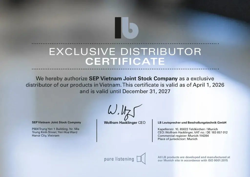 Công ty Cổ phần SEP Việt Nam tự hào thông báo: Kể từ ngày 01/04/2026, chúng tôi đã chính thức được cấp chứng nhận là Nhà phân phối độc quyền các sản phẩm của thương hiệu LB Lautsprecher und Beschallungstechnik GmbH tại thị trường Việt Nam.